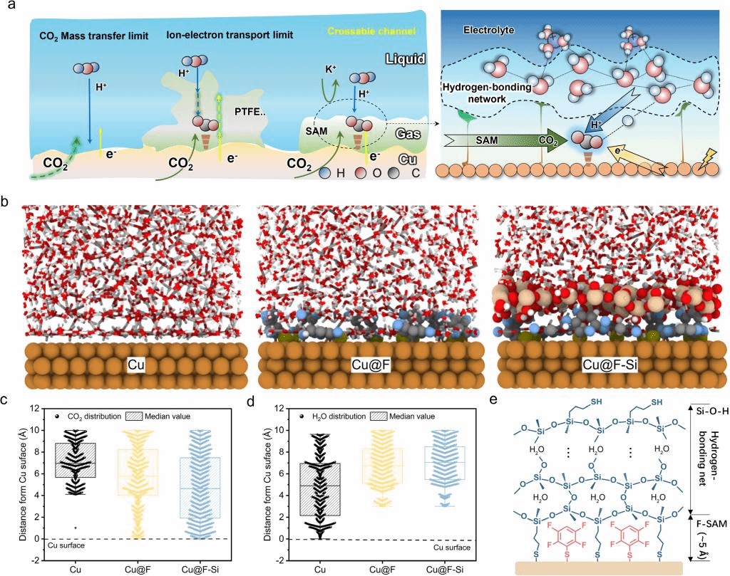 针对该问题,西安交大肖春辉教授和陈圣华研究员提出了一种氢键网络重构自组装氟化单分子层(F-SAM)策略,用于形成一个有助于物质传输和离子/电子转移的高效三相界面。该方法通过在商用铜催化剂上共组装F-SAM和硅氧烷来实现,记Cu@F-Si。其中,内层的F-SAM均匀分布在电极表面并形成分子屏障,在抑制析氢反应的同时促进CO2的传输;而外层的硅氧烷氢键网络调节了界面水分子的结构,促进质子供应,实现深度加氢,提升了C2+产物的选择性。此外,界面强氢键网络维持了理想的H+/e-转移路径,减轻了盐沉积和游离水对催化剂性能的影响,催化层的稳定性得以提升。最终,Cu@F-Si催化剂在502.5 mA cm-2的高电流密度下保持了超过85%的C2+法拉第效率,并在约300 mA cm-2的电流密度下稳定运行超过100小时。这一界面工程策略为提高CO2RR效率提供了一个有效的解决方案,并在多相催化系统中有广泛的应用前景。