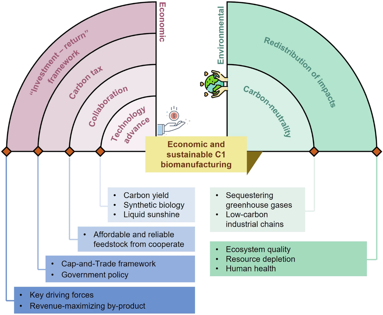 针对这一空白,费强团队近期借助TECA平台技术,结合生物转化一碳原料合成化学品的最新研究成果与实验数据展开模拟计算及综合分析,提出了一碳生物制造从实验室迈向工业规模的展望。该研究构建贯穿实验室研发到工业化生产的全链条评价体系,对一碳生物制造技术路径的经济性与环境影响进行全面收敛性评估。通过精细化拆解成本、动态推演效益、溯源追踪碳足迹,全方位剖析产品的经济效益和可持续性,旨在推动化学品生产去化石化,促进循环碳经济和可持续发展,为生物制造产业顶层设计提供依据,有力推动一碳生物制造商业化与产业化,助力循环碳经济发展和碳中和目标实现。该研究通过案例研究剖析一碳生物制造商业化的关键经济和技术障碍,提出提升成本竞争力的可行路线图,强调其作为传统化学生产的可扩展和可持续替代方案,以及在助力碳中和方面的潜力(图1)。