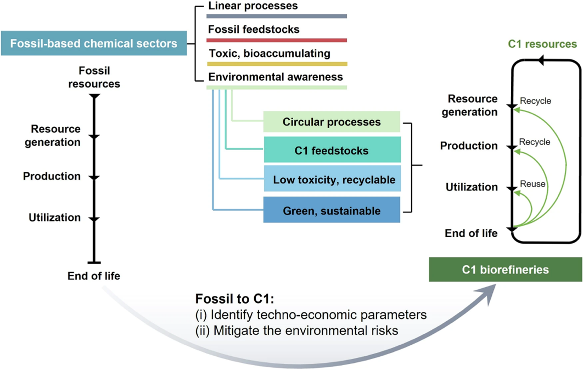图1 从基于化石基原料的生产路线到循环一碳生物制造的转变