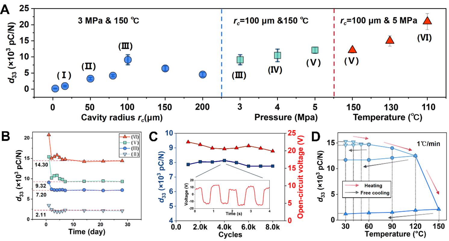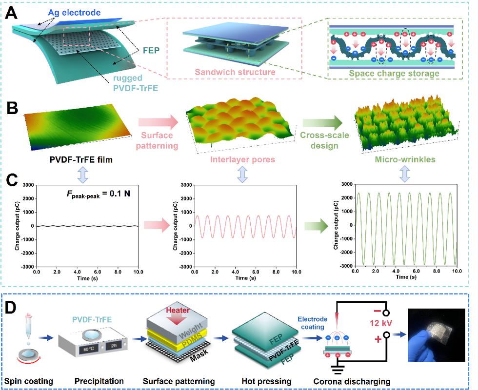 针对上述问题,西安交通大学徐明龙教授团队提出了一种基于柔性驻极体材料的超高等效压电效应薄膜设计和研制方法。如图1A-C所示,团队利用由两层氟化乙烯丙烯(FEP)和夹在其间的聚偏氟乙烯-三氟乙烯共聚物(PVDF-TrFE)形成了三明治型的压电驻极体复合薄膜结构,并对夹心层进行了图案化设计,形成了具有宏观尺度的孔隙结构;在此基础上,利用热应力过程在界面处形成更小尺度的褶皱,从而跨尺度地提升了净电荷存储的等效面积。再通过电极化使得这种褶皱设计的两侧存储了异号的净电荷,形成了等效的定向偶极子。因此,该驻极体材料受到力学载荷作用发生变形时,等效偶极矩的变化引发了局部电场变化,在外电路上产生了超高的等效压电效应。