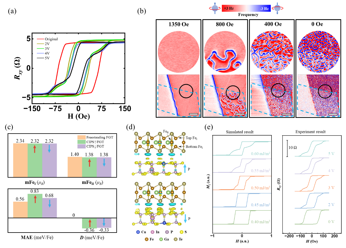 团队围绕该异质结从多个尺度开展了系统研究。通过霍尔测试显示出磁滞回线随极化电压的显著变化,表明磁性状态可被稳定调控;以磁力显微镜成像清晰捕捉了磁畴在电场、磁场、温度作用下的动态演化过程;通过第一性原理计算揭示了极化态诱导的界面DMI增强效应;结合微磁模拟复现了霍尔测试中观察到的磁化翻转行为。研究表明,电极化驱动的界面DMI调控机制能够降低磁畴壁形成能、促进磁畴的非协同(non-coherent)翻转,从而实现铁磁性的非易失调控。本项研究不仅实现了全二维异质结构在室温下的磁电耦合调控,还在理论机制与实验观测之间构建了高度一致的物理图像,为后续自旋电子器件的功能设计与材料开发提供了参考,使其在低功耗存算器件、拓扑磁结构调控等领域具备广阔的应用前景。