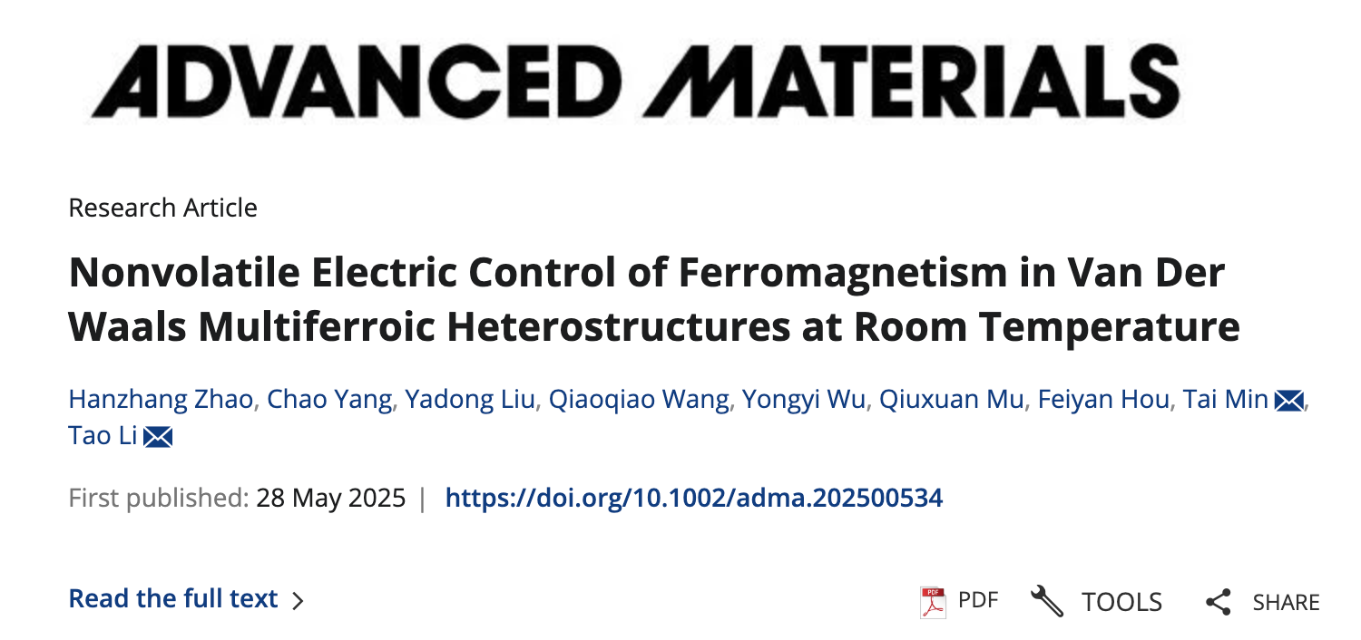 该成果以《室温条件下范德华多铁异质结构中铁磁性的非易失性电场调控》(Nonvolatile Electric Control of Ferromagnetism in Van Der Waals Multiferroic Heterostructures at Room Temperature)为题,5月28日在线发表于国际材料领域知名期刊《先进材料》(Advanced Materials)。西安交通大学材料学院博士研究生赵含章为论文第一作者,闵泰教授与李桃教授为共同通讯作者。
