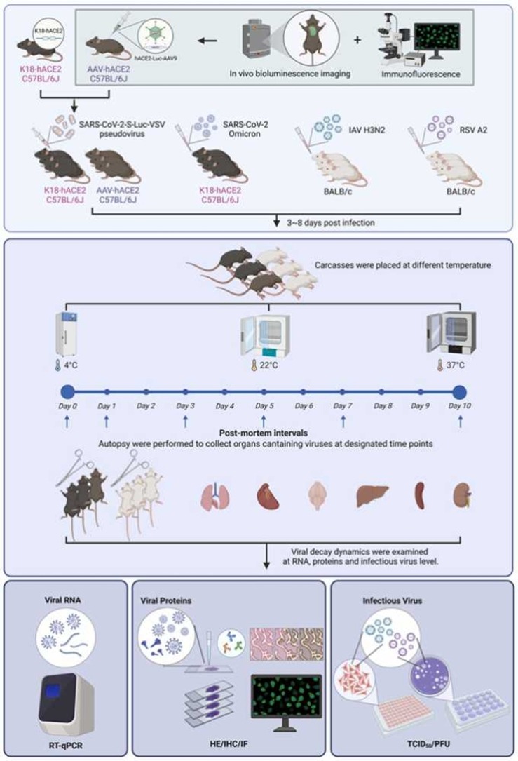 近年来,新型冠状病毒(SARS-CoV-2)全球大流行,叠加流感病毒(IAV)、呼吸道合胞病毒(RSV)等高致病性呼吸道病毒的频繁暴发,给全球公共卫生系统带来前所未有的重压。既往研究大多聚焦于病毒的“活体传播”,对个体死亡后病毒存活与感染性变化缺乏系统性研究。尤其是在尸体处理、法医学检验与高风险职业暴露等环节,病毒是否在死后仍具备传染力?在不同组织中如何分布?不同病毒之间的存活时间是否存在差异?这一系列关键问题长期被忽视,却直接关系到法医、医生、防疫人员等高风险从业人群的生命安全,亟需开展交叉学科的前瞻性研究攻关。