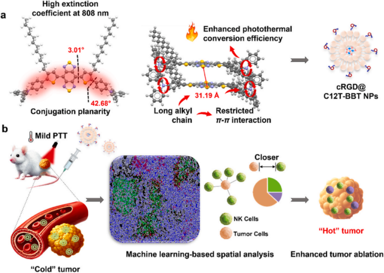 团队成功研发新型近红外二区聚集诱导发光(NIR-II AIE)分子 C12T-BBT,进而以该分子为主体合成纳米药物cRGD@C12T-BBT。在红外光激发下,cRGD@C12T-BBT能够产生温和光热效应(PTT),有效募集并激活肿瘤局部自然杀伤细胞(NK),从而触发免疫响应(PIT)。并且,团队创新性整合新型空间分析技术与生物学技术,系统解析了NK细胞在肿瘤微环境中的空间组学特征以及生物学机制。研究表明,cRGD@C12T-BBT具有多功能的优势,能够实现诊疗一体化的PTT/PIT协同效应,具有显著的临床转化应用价值。相关研究成果发表于生物医学与工程技术领域权威期刊《生物材料》(Biomaterials)。