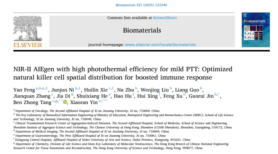 研究成果以《具有高光热效率的近红外二区聚集诱导发光小分子药物用于温和光热治疗:优化自然杀伤细胞空间分布以增强免疫应答》(NIR-II AIEgen with high photothermal efficiency for mild PTT: Optimized natural killer cell spatial distribution for boosted immune response)为题,在生物医学及生物工程领域国际权威期刊《生物材料》(Biomaterials)发表。第一作者为西安交通大学医学院博士生冯焱,共同第一作者为西安交通大学生命学院博士生倪钧钧以及香港科技大学博士生谢会琳;末位通讯作者为西安交通大学第二附属医院肿瘤内科尹晓然教授,共同通讯作者为香港科技大学唐本忠院士以及西安交通大学生命学院靳国瑞教授。研究团队充分结合跨领域的医学专家及科学家在临床医学、材料科学、生物医学等领域的优势,长期深耕医工交叉融合领域,围绕小分子荧光染料、多功能纳米药物,开展“创新研发—机制探索—转化应用”的全链条协同攻关。