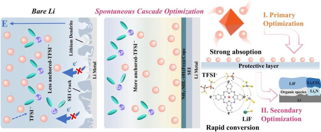 针对这一问题,西安交通大学化学学院丁书江教授&于伟副教授团队等人提出了双富集驱动的自发级联优化策略。具体来说,NH2-MIL-101(Fe)通过Lewis酸碱相互作用和协同的氢键作用锚定阴离子,从而实现初级优化。随后,Copc 富电子结构实现了电子离域,同时降低了阴离子分解的能垒,使 C-F 键更容易断裂,从而实现了进一步优化。MOF 与 Copc 之间的 π-π 堆叠相互作用促进了吸附位点与催化位点的紧密结合,使 C-F 系列产物在链式反应中不断分解。组装后的 LFP(19.26 mg cm-2)具有商业级阴极面积容量,在 1 C 条件下循环 350 次后,容量保持率超过 90%,且每次循环的容量衰减率仅为 0.02%。