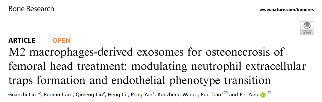 西安交大二附院骨科中心关节与足踝病区王坤正教授、杨佩教授团队通过单细胞转录组测序技术,首次系统揭示了股骨头坏死(ONFH)坏死区中性粒细胞胞外诱捕网(NETs)异常激活的关键病理特征,研究成果以《M2巨噬细胞外泌体调控中性粒细胞胞外杀菌网络形成与成血管表型治疗股骨头坏死》为题在骨科领域国际顶级期刊《骨研究》(Bone Research)(影响因子:14.3)发表,首次报道了单细胞层面解析股骨头坏死的坏死区骨组织的细胞生物学特征,并提出基于M2巨噬细胞外泌体(M2-Exos)的创新性治疗策略,为临床转化提供了重要理论依据。