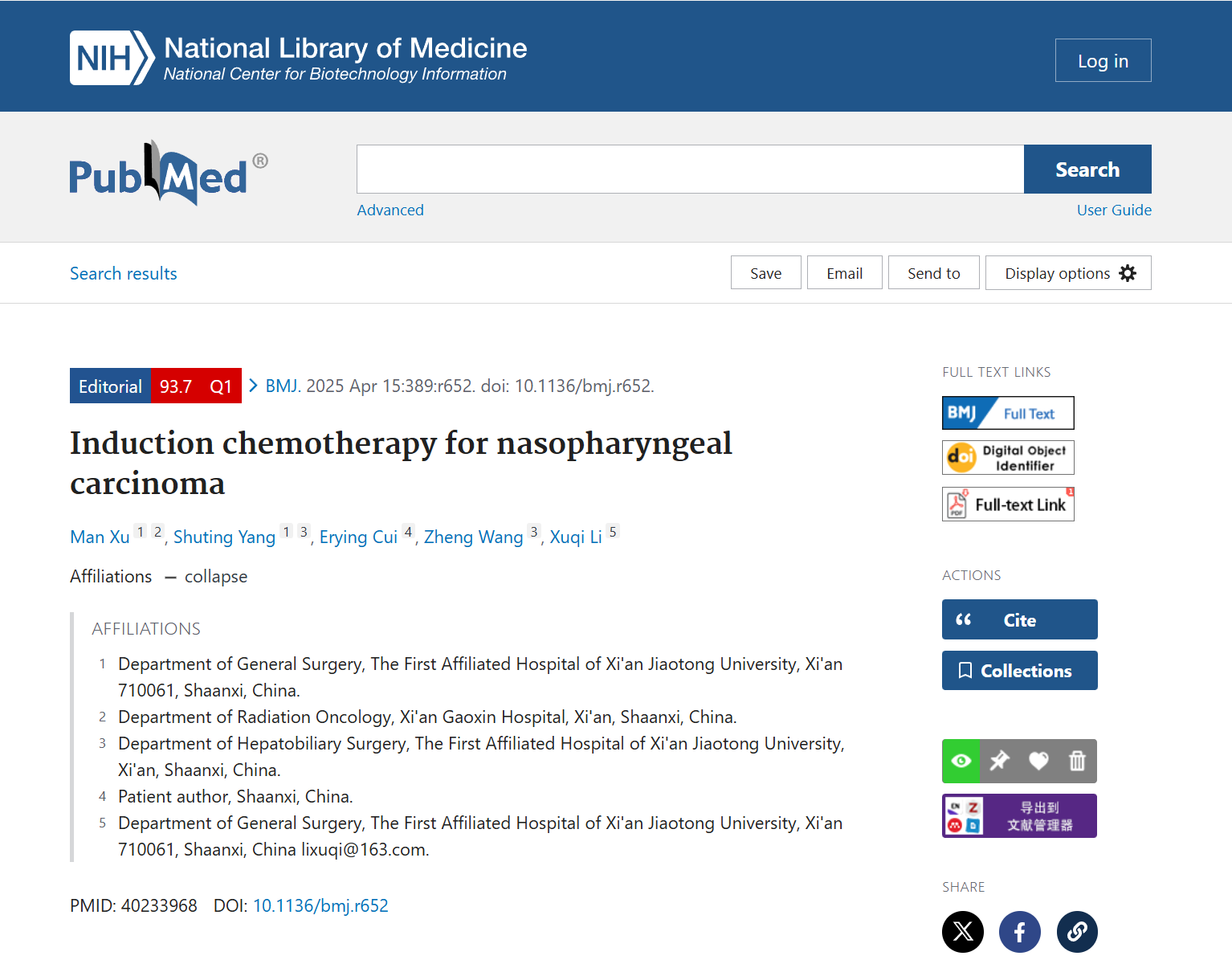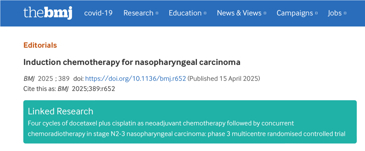 4月15日,一附院普通外科李徐奇团队在国际顶级医学期刊《英国医学杂志》(The BMJ,影响因子93.6),发表题为《鼻咽癌诱导化疗:局部晚期疾病的新治疗选择》(Induction chemotherapy for nasopharyngeal carcinoma A new treatment option for locally advanced disease)的学术社论文章(Editorial 类型)。