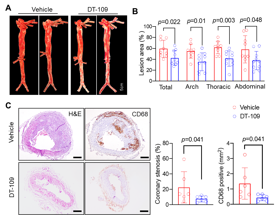 图1 DT-109显著改善食蟹猴主动脉(A, B) 和冠状动脉(C) AS病理损伤。