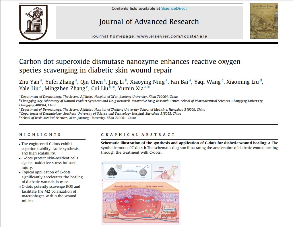 西安交通大学第二附属医院皮肤病院夏育民教授团队长期从事皮肤损伤修复领域研究。近日,该团队在糖尿病皮肤伤口修复领域取得重大突破,研究成果以“碳点超氧化物歧化酶纳米酶通过增强活性氧清除促进糖尿病皮肤伤口修复”(Carbon dot superoxide dismutase nanozyme enhances reactive oxygen species scavenging in diabetic skin wound repair)为题发表于国际知名期刊《先进研究杂志》(Journal of Advanced Research),首次报道了碳点超氧化物歧化酶纳米酶(carbon dot superoxide dismutase nanozyme,简称C-dots)在糖尿病皮肤伤口修复中的显著疗效。该团队近年来在《研究皮肤病杂志》(J Invest Dermatol.2019;139:224-234)、《干细胞研究治疗》(Stem Cell Res Ther.2020;11:232)、《世界伤口修复再生》(Wound Repair Regen.2025;33:e13247)发表多项研究成果。