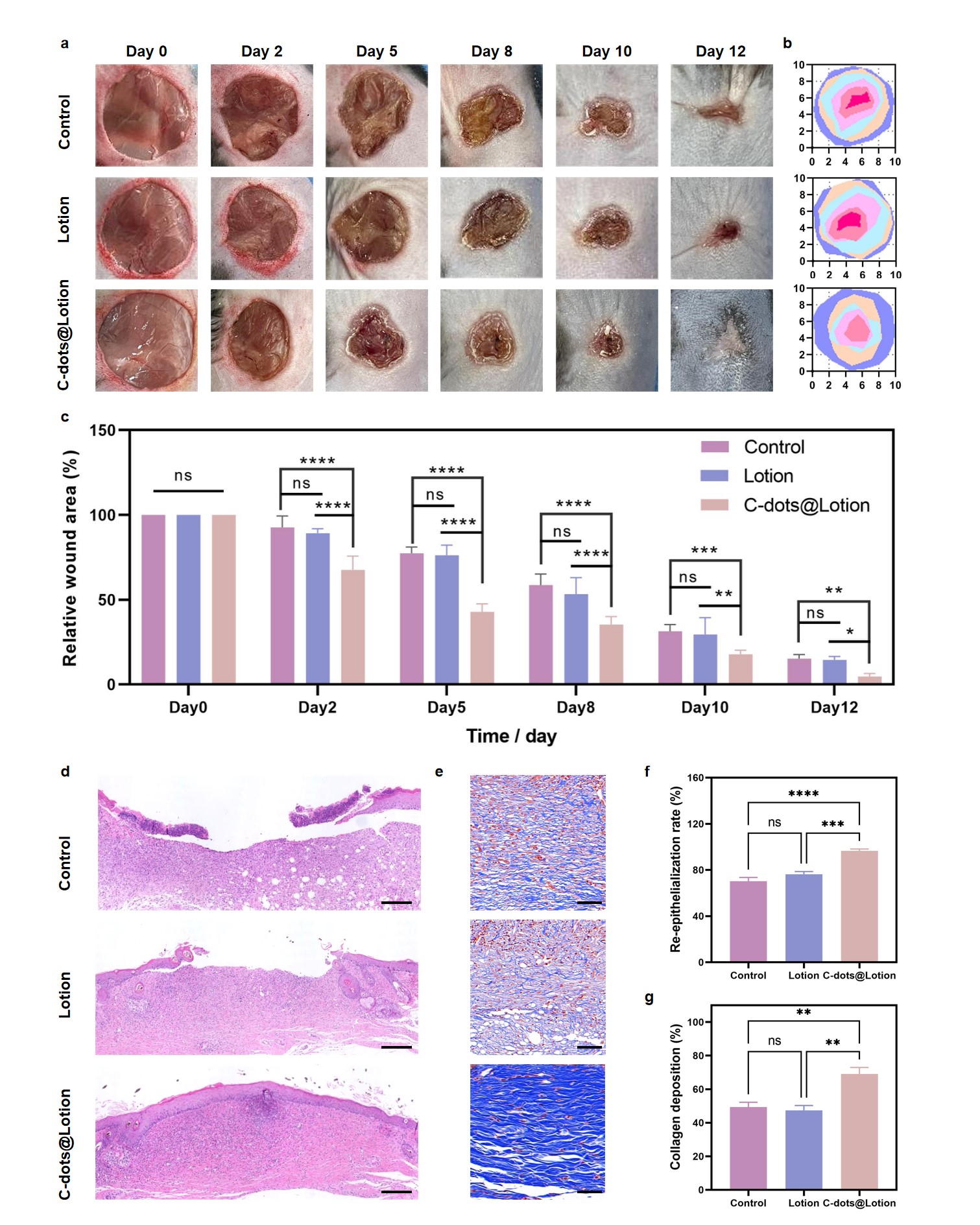 在体内实验中,研究团队使用链脲佐菌素(STZ)诱导的糖尿病小鼠模型,评估了C-dots对糖尿病皮肤伤口愈合的促进作用。实验结果显示,C-dots处理组的小鼠伤口愈合速度显著加快,伤口面积在第12天几乎完全闭合,而对照组和仅使用溶液基质的组伤口仍未愈合。组织学检查表明,C-dots处理组的伤口再上皮化率更高,胶原纤维沉积更丰富、更有序。此外,C-dots还能显著降低伤口组织中的ROS水平,减少氧化应激标志物8-OHdG和iNOS的表达,降低促炎细胞因子TNF-α和IL-6的水平,并促进巨噬细胞从促炎M1表型向抗炎M2表型转变,促进新生血管形成,并且加速伤口愈合。
