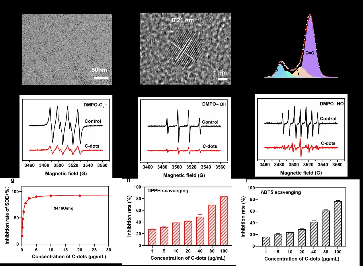 该研究中成功合成了具有超氧化物歧化酶(SOD)活性的碳点纳米酶(C-dots)。这种纳米酶能有效清除过量的活性氧(ROS),减轻与氧化应激相关的疾病。研究中,团队通过透射电子显微镜(TEM)和X射线光电子能谱(XPS)等技术对C-dots的结构进行了表征,证实了其表面存在碳-碳双键、碳-氧单键等功能基团。这些功能基团的存在为C-dots的抗氧化活性提供了结构基础。在体外实验中,C-dots表现出强大的抗氧化能力,能有效清除超氧阴离子、羟基自由基和一氧化氮自由基,其SOD样活性高达9416 U/mg,远高于其他一些已报道的SOD纳米酶。此外,C-dots在清除DPPH自由基和ABTS自由基的实验中也表现出色,证实了其良好的ROS清除能力。