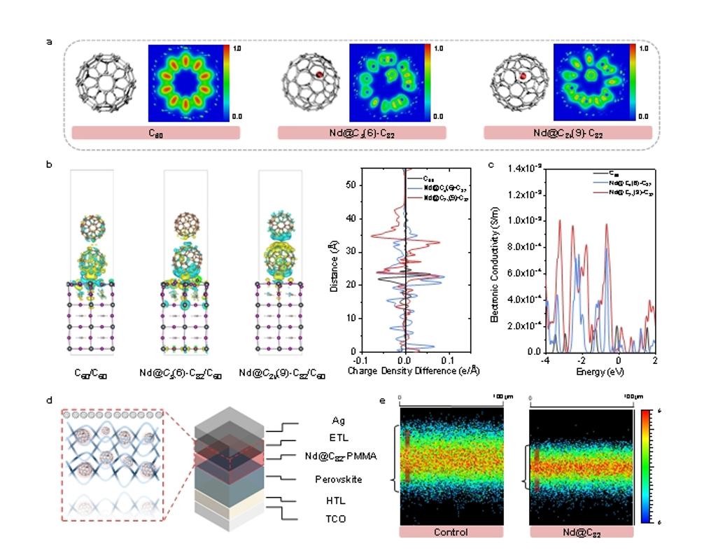 该研究的核心创新点在于利用内嵌金属富勒烯分子Nd@C82作为电磁耦合传输介质,可通过界面极化增强电子提取能力和效率,进而耦合聚合物PMMA使该界面兼具了优异结构保护性能和超快电子选择传输特性,确保了电池中均质且超快电子提取,从而兼顾超快电子提取和原位封装的特点,促进均匀的电子提取并抑制离子相互扩散,最终显著提升了钙钛矿太阳能电池在高温、高湿等复杂环境下的PCE和运行寿命,拓展了其在户外及实际应用场景中的发展潜力。