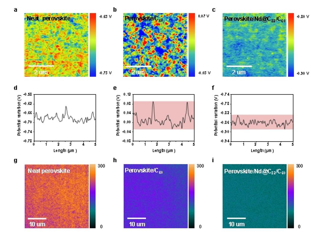 图2 具有Nd@C82-PMMA耦合层钙钛矿薄膜的电学和光学性质。(a-c)钙钛矿薄膜、钙钛矿/C60薄膜和钙钛矿/Nd@C82/C60薄膜的表面电势图。(d-f)钙钛矿薄膜、钙钛矿/C60薄膜和钙钛矿/Nd@C82/C60薄膜的表面电势变化。(g-i)钙钛矿薄膜、钙钛矿/C60薄膜和钙钛矿/Nd@C82/C60薄膜的光致发光扫描成像图。