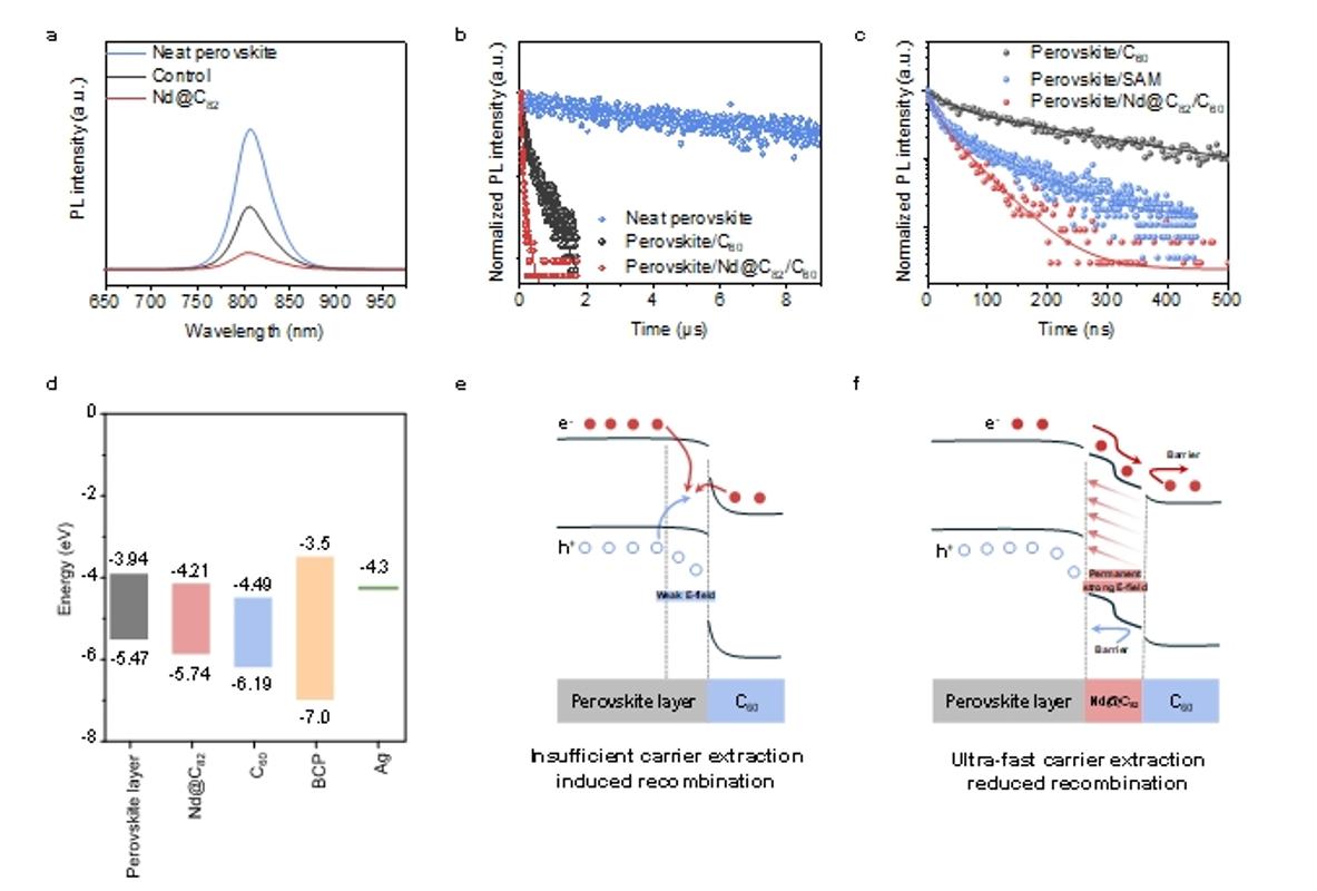 图3 Nd@C82-PMMA耦合层用于平衡电荷载流子传输。(a)钙钛矿薄膜、对照组薄膜(钙钛矿/C60)和Nd@C82(钙钛矿/Nd@C82/C60)薄膜的光致发光光谱图。(b)钙钛矿薄膜、对照组薄膜(钙钛矿/C60)和Nd@C82(钙钛矿/Nd@C82/C60)薄膜的时间分辨荧光光谱图。(c)钙钛矿/C60薄膜、钙钛矿/自组装单层(SAM)薄膜、钙钛矿/Nd@C82/C60薄膜的时间分辨荧光光谱图。(d)钙钛矿和电子传输层之间的能带排列。(e-f)能带排列示意图。