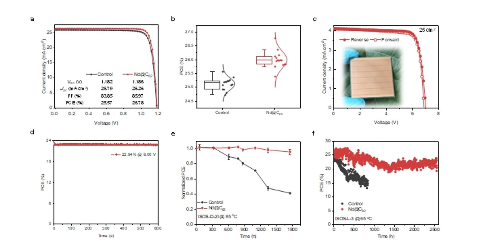 图4 基于Nd@C82制备器件的光伏性能。(a)最优的对照组和基于Nd@C82制备器件的J-V曲线。(b)从J-V曲线中获得的光电转换效率值的统计数据。(c)基于Nd@C82制备的最优模组的J-V曲线。(d)最优模组的最大功率点输出曲线。(e)基于ISOS-D-2I测试协议下器件的稳定性。(f)基于ISOS-L-3测试协议下器件的稳定性。