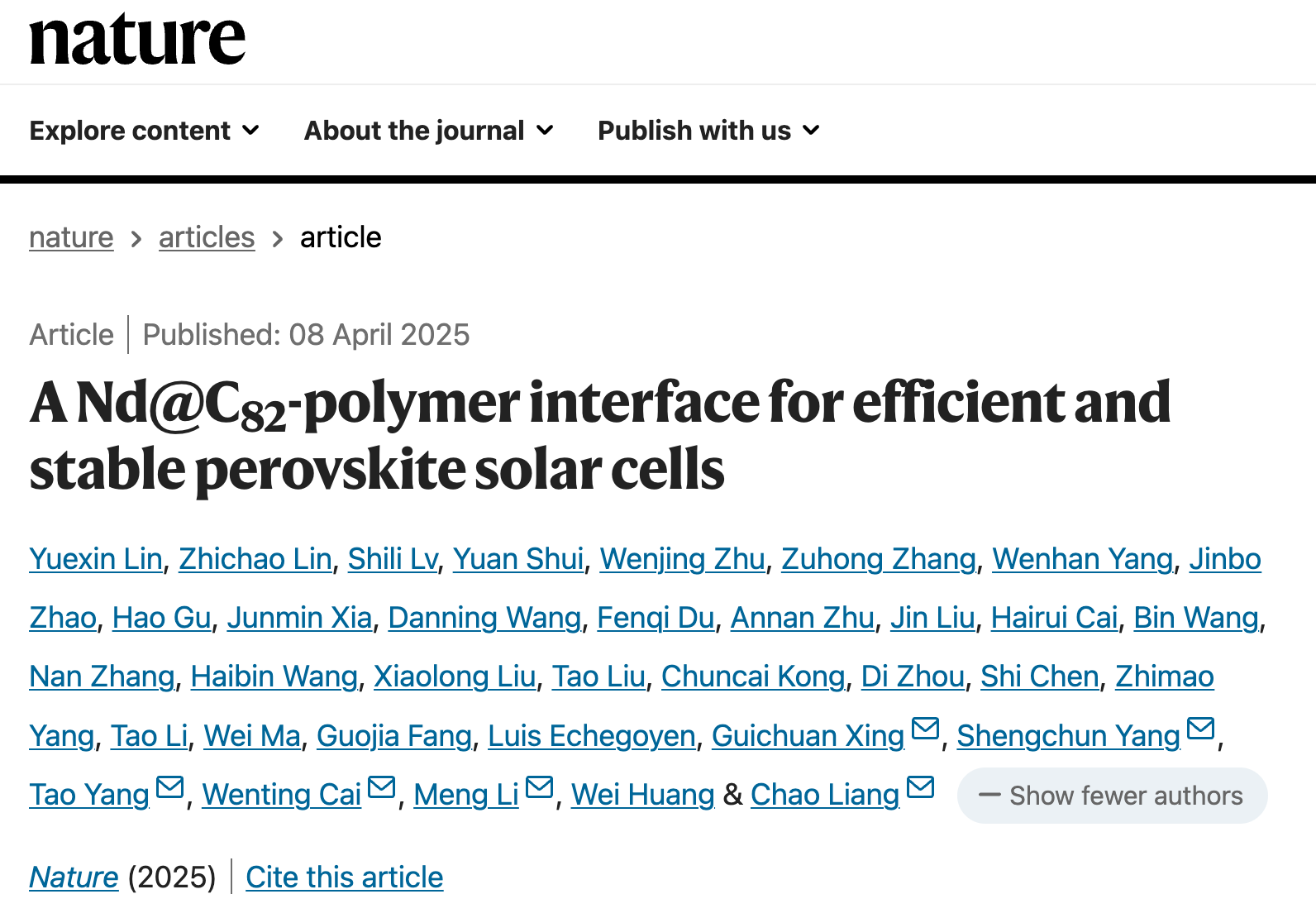 该研究成果以《Nd@C82-聚合物界面应用于高效稳定钙钛矿太阳能电池》(“A Nd@C82-polymer interface for efficient and stable perovskite solar cells”)为题于4月8日在《自然》(Nature)期刊上在线发表。西安交通大学物理学院博士研究生林越辛、水源、朱文静,西安交通大学化学学院硕士研究生吕世丽,福建农林大学林智超博士为论文共同第一作者;物理学院梁超研究员、杨生春教授、杨涛研究员,化学学院蔡文婷研究员(丁书江教授团队),澳门大学邢贵川教授,河南大学李萌教授为论文通讯作者;西安交通大学物理学院为本论文第一完成单位。论文得到了西安交通大学分析测试中心在材料结构测试与分析方面提供的大力支持,特别是郭航、梁艳、周国庆和张杨提供了相关表征和分析支持。本研究得到了国家重点研发计划、国家自然科学基金、西安交通大学青年拔尖人才支持计划和中央高校基本科研业务费专项资金等项目的资助。