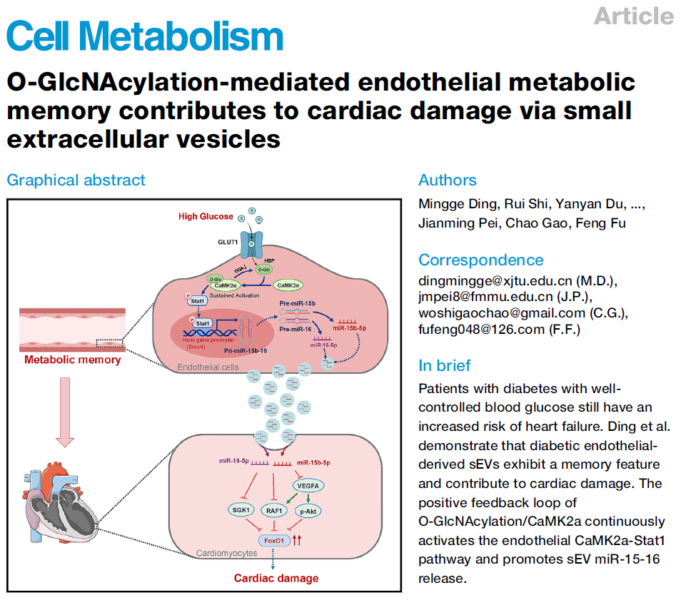 研究成果以长文(Article)形式发表于《细胞》(Cell)大子刊《细胞代谢》(Cell Metabolism(IF:27.7)),题为“O-Glc糖基化介导的内皮代谢记忆通过细胞外小囊泡诱导心脏损伤”(O-GlcNAcylation-mediated endothelial metabolic memory contributes to cardiac damage via small extracellular vesicles)。丁铭格教授课题组近年在《氧化还原生物学》(Redox Biology(2021, 2022, IF=10.7))、《前沿研究杂志》(Journal of Advanced Research(2023, IF=11.4))发表系列研究成果。