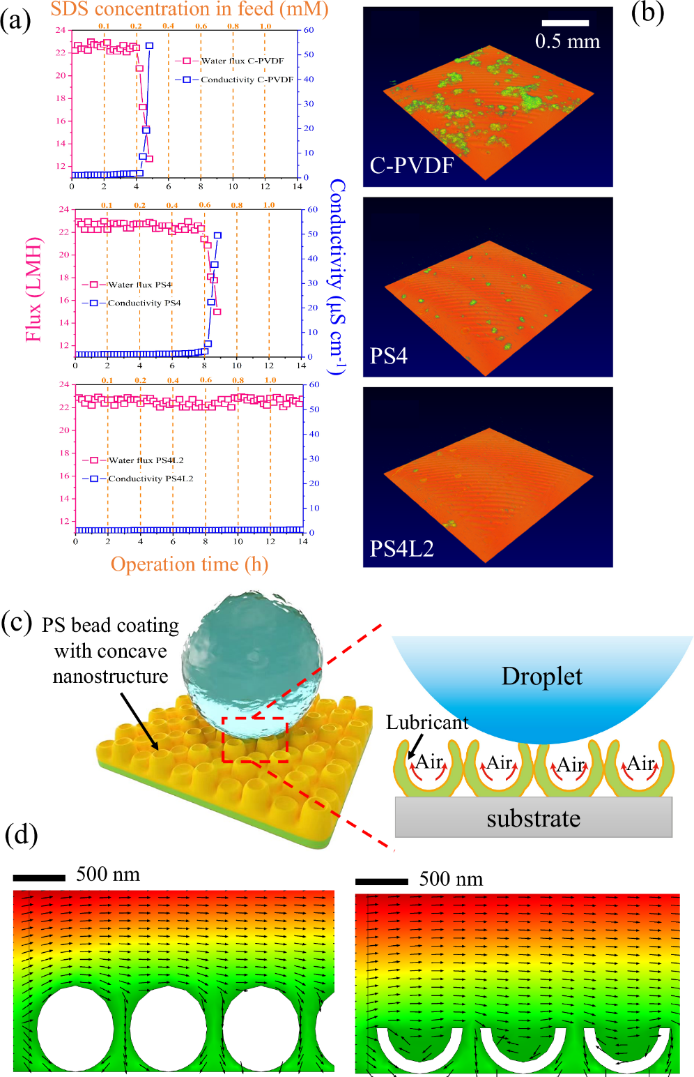 图4(a)C-PVDF、PS4 和 PS4L2 膜的分子动力学(MD)性能分析;(b)分子动力学模拟后膜表面的光学相干断层扫描(OCT)图像展示;(c)具有纳米凹陷回转结构膜的抗润湿性能原理示意图;(d)基于流体流动和粒子追踪模拟的纳米结构与进料溶液相互作用机制研究。