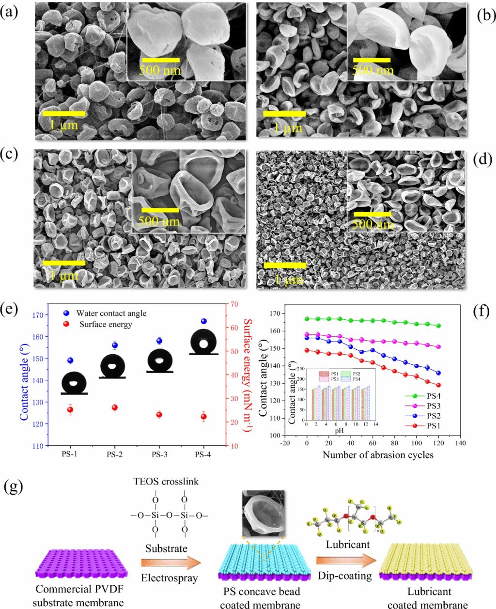 本研究采用静电喷雾技术制备了具有凹腔结构的聚苯乙烯(PS)纳米颗粒,并将其涂覆在商业聚偏氟乙烯(PVDF)膜上。通过控制环境湿度和施加电压,优化了PS颗粒的形态,使其形成类似于弹尾虫皮肤的凹腔结构。随后,采用低毒性短链全氟聚醚(PFPE)润滑剂进行浸涂,进一步降低表面能,赋予膜全疏水性。本研究采用等离子体活化策略在基底膜表面引入羟基官能团,与润滑剂中的羧基进行脱水缩合反应形成共价交联网络,实现涂层与基底膜之间界面结合强度的优化。