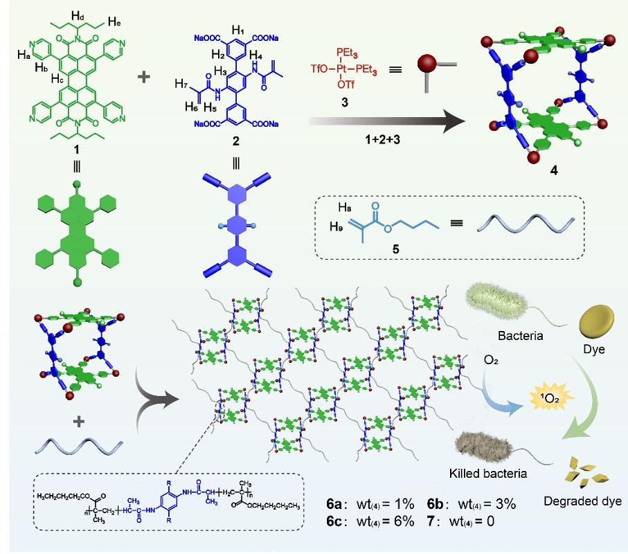 针对这一问题,西安交通大学材料学院张明明教授课题组利用金属笼(由金属配位键构建的三维结构)与丙烯酸酯单体,通过紫外光诱导共聚,成功制备出自支撑超分子网络材料。该技术以温和条件(无需高温、催化剂或强酸碱性环境)实现金属笼结构的完整保留,解决了传统聚合破坏配位键的难题。材料中金属笼的高密度空腔可负载并敏化底物,显著提升单线态氧(¹O₂)生成效率,从而增强光催化与抗菌性能。实验表明,该材料在可见光下可快速降解有机染料,周转效率远超传统催化剂。同时,其光动力效应能高效杀灭水中细菌,净化后的水体成功支持植物健康生长,验证了技术安全性与生态兼容性。
