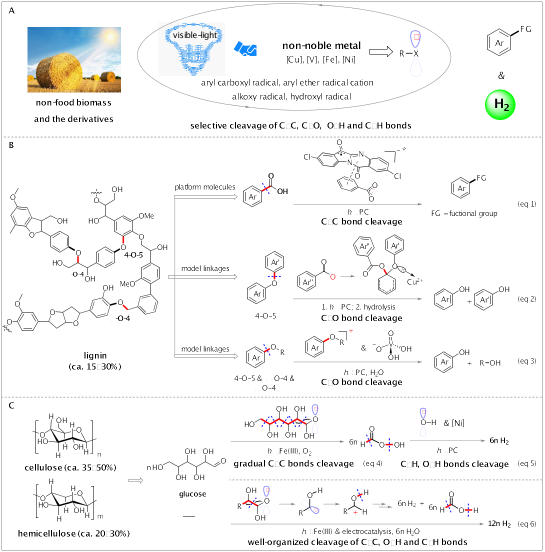 图1 可见光诱导的自由基选择性转化生物质及其衍生物制备芳香化学品和氢气