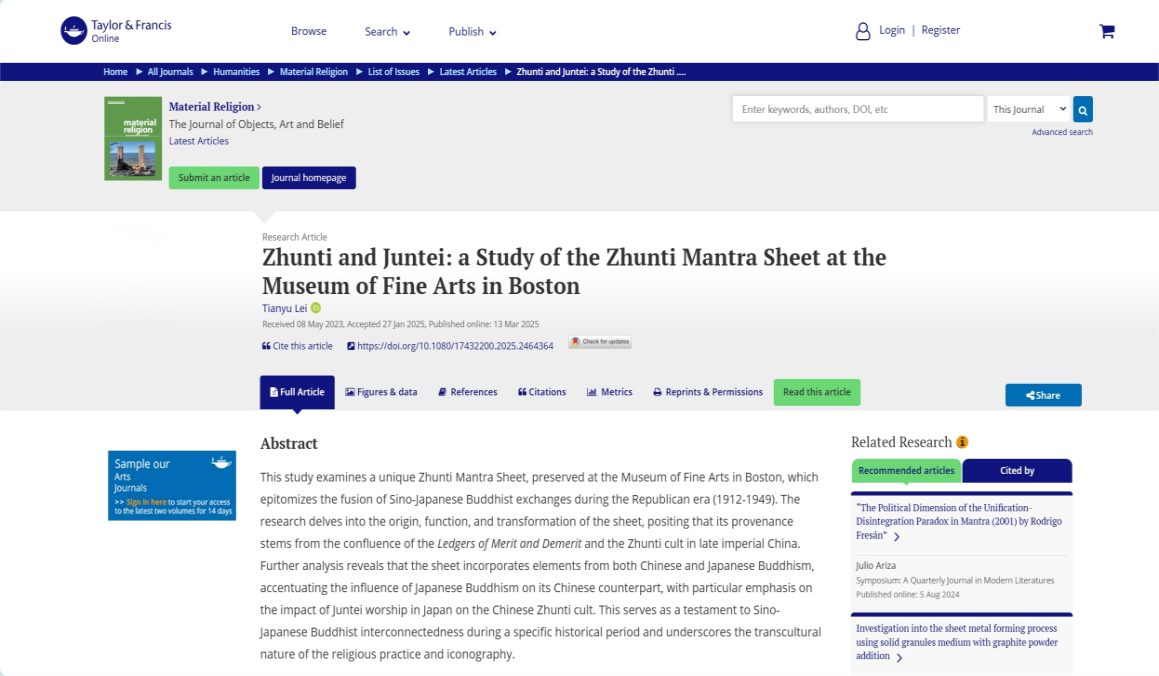 以上研究以《准提与准胝:波士顿美术馆藏准提咒图研究》(Zhunti and Juntei: a Study of the Zhunti Mantra Sheet at the Museum of Fine Arts in Boston)为题发表在国际权威学术期刊《物质宗教》(Material Religion)上。该刊由国际知名学术出版社劳特利奇(Routledge)发行,被艺术与人文科学引文索引(A&HCI)收录,以严格的同行评审和高学术门槛著称,被视为宗教物质文化研究领域的标杆。西安交通大学人文社会科学学院为论文唯一通讯单位,雷天宇助理教授为论文唯一作者。