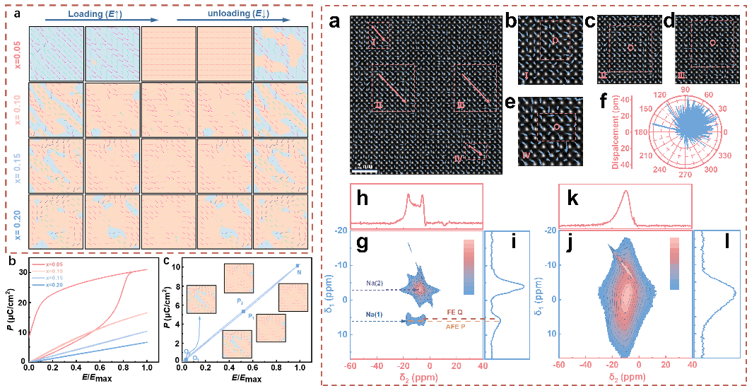 本工作中提出在反铁电NN体系中引入铁电相,打破长程有序的反铁电宏畴,降低畴之间的翻转势垒,从而提高弛豫特性,进一步优化能源存储性能的研究思路。本工作中首先采用相场法模拟了(1-x)NaNbO3-xBi(Ni0.5Hf0.5)O3(NN-BNH)二元体系中微观极化矢量的排布和宏观电滞回线的变化,发现随着客相BNH掺杂含量的增加,长程有序2×2正交反铁电极化调制结构被逐渐打破成定向纳米畴,同时伴随着剩余极化的大幅度降低(如图1左图)。其次,球差电子显微镜(STEM)表明NN基体系中存在O型极性纳米微区,大量具有多个局域无序特征的极化基体有助于不同尺寸的O型纳米结构畴之间的过渡,类似于雪泥状极性结构,且0 ~ 120°范围内的极化矢量占比为88.3%,远高于其它角度范围(120 ~ 360°)的11.7%,因此将其定义为定向类雪泥状极性结构,这有利于提高Wrec和h;二维固体核磁(2D NMR)表明0.15 mol BNH的客相成分进入主相NN基体后,导致Na(1)位点畸变较小,局域结构更加无序,这进一步证明该成分处于弛豫状态(如图1右图)。