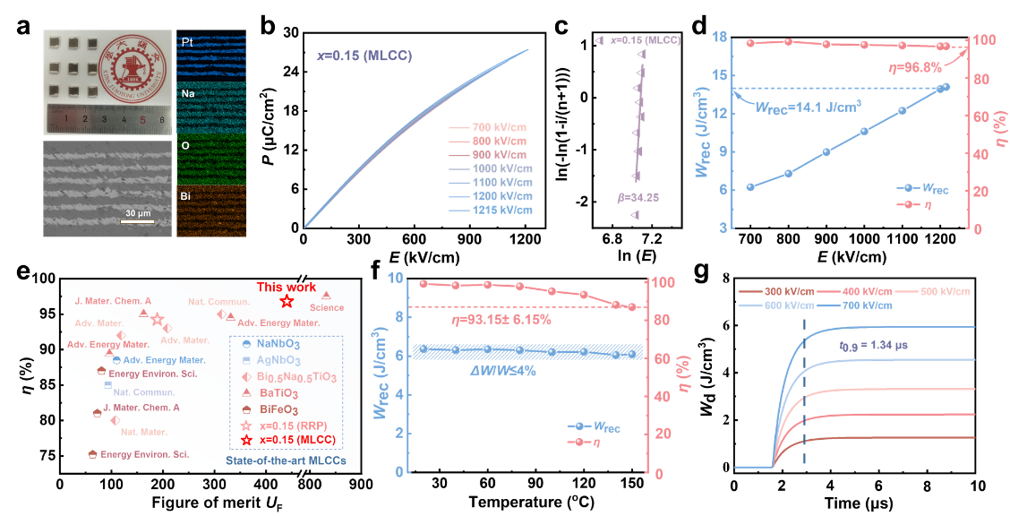 随后,采用这种定向类雪泥状极性结构设计策略制备出NN基多层陶瓷电容器(MLCC),在x=0.15组分的MLCC中获得了14.1 J·cm-3的高储能密度和96.8%的超高储能效率,且在700 kV·cm-1电场下宽温(20-150 ℃)范围内具有良好的稳定性(变化率小于±6.15%),展现出了该陶瓷电容器的巨大应用潜力,如图2所示。