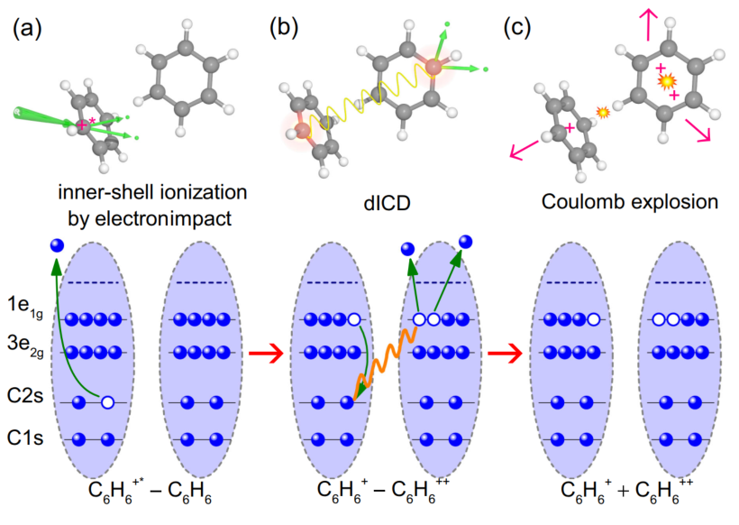 任雪光教授团队与合作者建立了电子碰撞和强场飞秒激光电离相结合的实验方案,发展生物分子团簇束源技术、多粒子符合动量成像方法,在实验上揭示了生物分子二聚体分子间双重库仑衰变机制(double intermolecular Coulombic decay, dICD,图1):以苯二聚体为例,苯二聚体中一个分子发生内壳层电离后,该分子的外价层电子填充内壳层空穴,释放的能量传递到相邻分子使其双电离,随后发生三体解离。通过对比电子碰撞和强场飞秒激光实验中多个解离通道的产率,发现dICD增强了分子开环解离产率。进一步对水合苯二聚体,吡啶二聚体和水合吡啶二聚体的实验表明,dICD诱导的增强解离是一种普遍现象。这些结果证明了虚拟光子近似理论在当前体系中的可行性,即分子间能量转移可以视为一个单光子传递过程。随着邻近分子数量的增长,dICD发生概率将进一步提升,因此在凝聚相物质中,dICD将发挥更加重要的作用。此外,相较于分子间库仑衰变(ICD)过程,dICD过程产生了更多的低能二次电子和离子自由基,能够导致更加严重的辐射损伤,这为解析生物辐射损伤效应提供了新的物理机制。