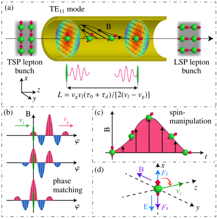 栗建兴教授团队针对相对论轻子束在超快时间尺度下的自旋操控难题,发展了基于太赫兹波导管的相对论轻子自旋演化理论,提出了利用太赫兹波导管实现轻子束超快自旋旋转方案。