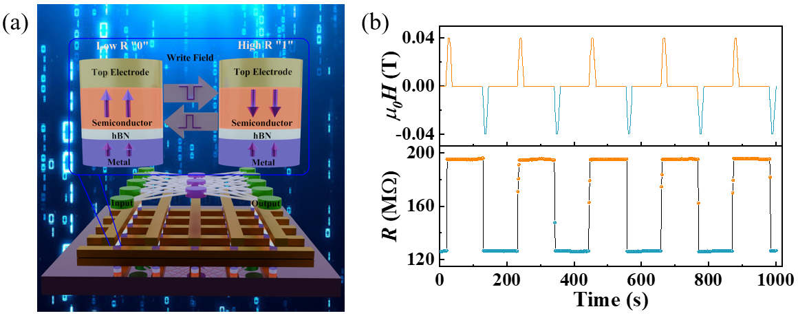 图4 (a)二维混合自旋过滤器示意图 (b)非易失性磁电阻