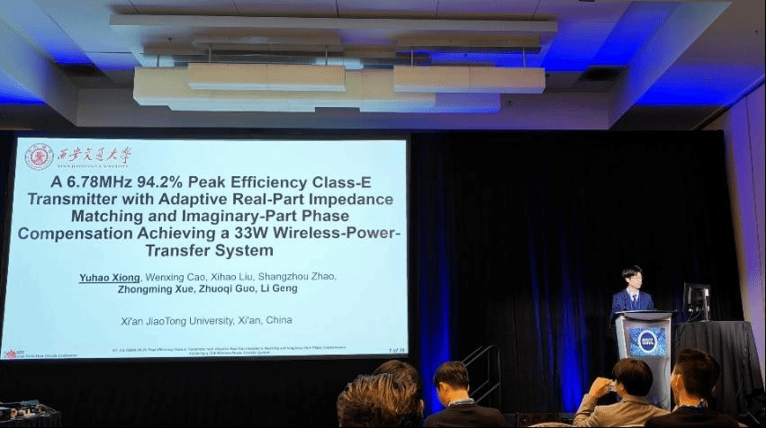 另外1篇论文来自耿莉教授课题组,论文题目为“A 6.78MHz 94.2% Peak Efficiency Class-E Transmitter with Adaptive Real-part Impedance Matching and Imaginary-part Phase Compensation Achieving a 33W Wireless Power Transfer System”。针对6.78MHz无线能量传输(WPT)系统的高效能量传输目标,聚焦于解决WPT系统发射端中因负载阻抗动态变化导致的效率降低问题,提出了一种自适应实部阻抗匹配技术与虚部相位补偿控制器协同设计方案。通过实时匹配负载阻抗的实部分量,并补偿虚部相移,发射机可在复杂阻抗范围内实现零电压开关(VS)与零电压导数开关(ZVDS),显著降低了开关损耗。同时,首次提出WPT发射端E类功率放大器任意阻抗条件建模和双向非线性回归设计方法,通过阻抗曲线与ZVS轨迹在复阻抗平面内对齐,为动态负载场景下阻抗匹配网络参数设计和高效功率传输提供了理论范式。论文第一作者是微电子学院博士生熊宇豪,共同通讯作者是薛仲明副教授、郭卓奇副教授和耿莉教授。