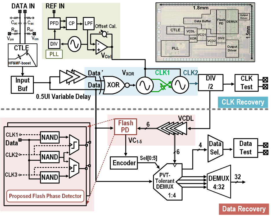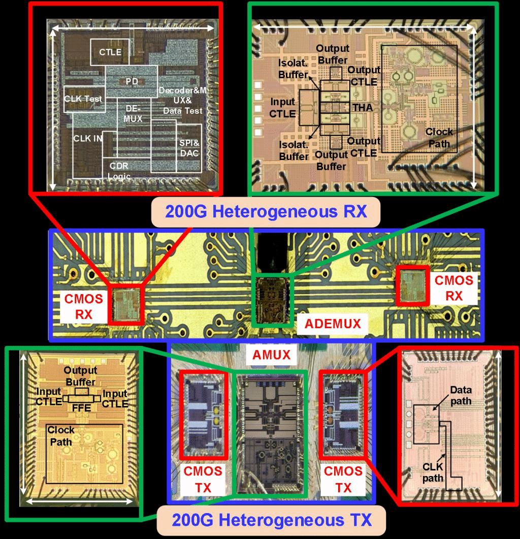 另一篇论文题目为“A Low-Latency 200Gb/s PAM4 Heterogeneous Transceiver in 130nm SiGe BiCMOS and 28nm CMOS for Retimed Pluggable Optics”,创新性地提出了一款异质集成的200G SerDes收发机,是学术界首个单通道200G SerDes收发机的完整解决方案。其中200Gb/s模拟MUX/DEMUX采用130nm SiGe BiCMOS工艺,100Gb/s混合信号收发机采用28nm CMOS工艺。该200G收发机用于重定时可插拔光学器件,从而在光端实现了200G性能,同时,不会受到电信道大插损的影响,与ODSP解决方案相比,可以在类似的能效下大大降低延迟。论文的共同一作为微电子学院博士生唐人杰和王卡楠,通讯作者为桂小琰教授。