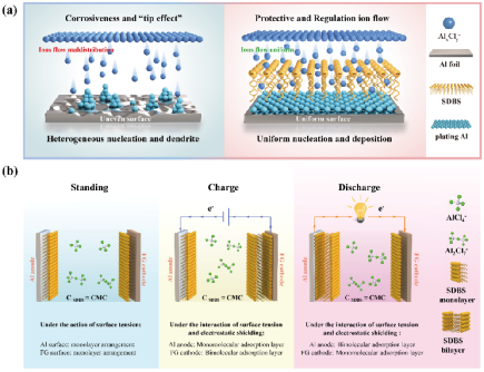 图1. (a) RABs中Al阳极/电解质界面示意图。(b)不同状态(静置、充电、放电)下电极表面SDBS分布示意图。