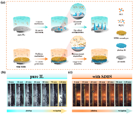 图2. (a) 纯ILs和SDBS优化电解质中沉积Al的机理示意图。(h-i)纯ILs和SDBS优化电解液中铝电镀/剥离过程的原位光学显微镜图像。
