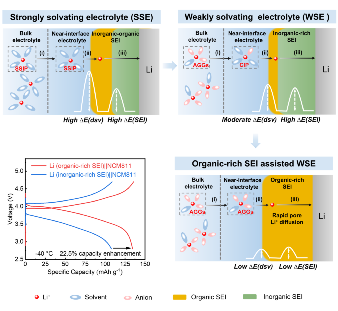 近日,西安交通大学化学学院丁书江教授团队意外发现,在低温条件下,富含无机物的SEI由于界面传输动力学迟缓会导致锂金属电池容量的严重下降,而溶剂衍生的富含有机物的SEI被证明由于其较弱的界面力和快速的孔隙扩散机制,表现出更低的界面阻抗。作为概念验证,采用有机硅电解液并结合低温化成循环,成功构建了富含有机物的SEI,其有机成分增加了16.51倍,最终使锂金属电池在-40 °C条件下的容量提高了22.5%。本研究打破了对富含有机物的SEI的传统认知,是低温电池设计理念和验证方面的重要进步。
