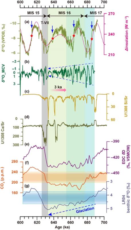 研究表明过去69万至64万年的千年尺度弱季风事件与北大西洋变冷和南极变暖的耦合关系与过去64万年没有显著差异,尽管根据北大西洋冰筏碎屑来源的变化推测AMOC可能在64万年前发生了路线转移(图2),这一结果为我们研究AMOC的控制因素及其级联提供了新的认知。该研究还强调了AMOC减弱事件及其引发的亚洲季风减弱与每个岁差尺度太阳辐射的减弱均相关联,并不仅仅限于间冰期结束时太阳辐射的减弱。此外,大气CO2和全球冰量作为关键因素在深海氧同位素16阶段中依然起到调节千年事件变幅的作用(图2)。研究进一步将石笋δ18O记录与其他亚洲夏季风记录进行对比,发现不同记录的千年事件及其振幅存在差异,研究人员认为该差异可能是由于不同指标只记录了季风系统的某一方面,即动力学、热力学特质又或两者的混合特征。
