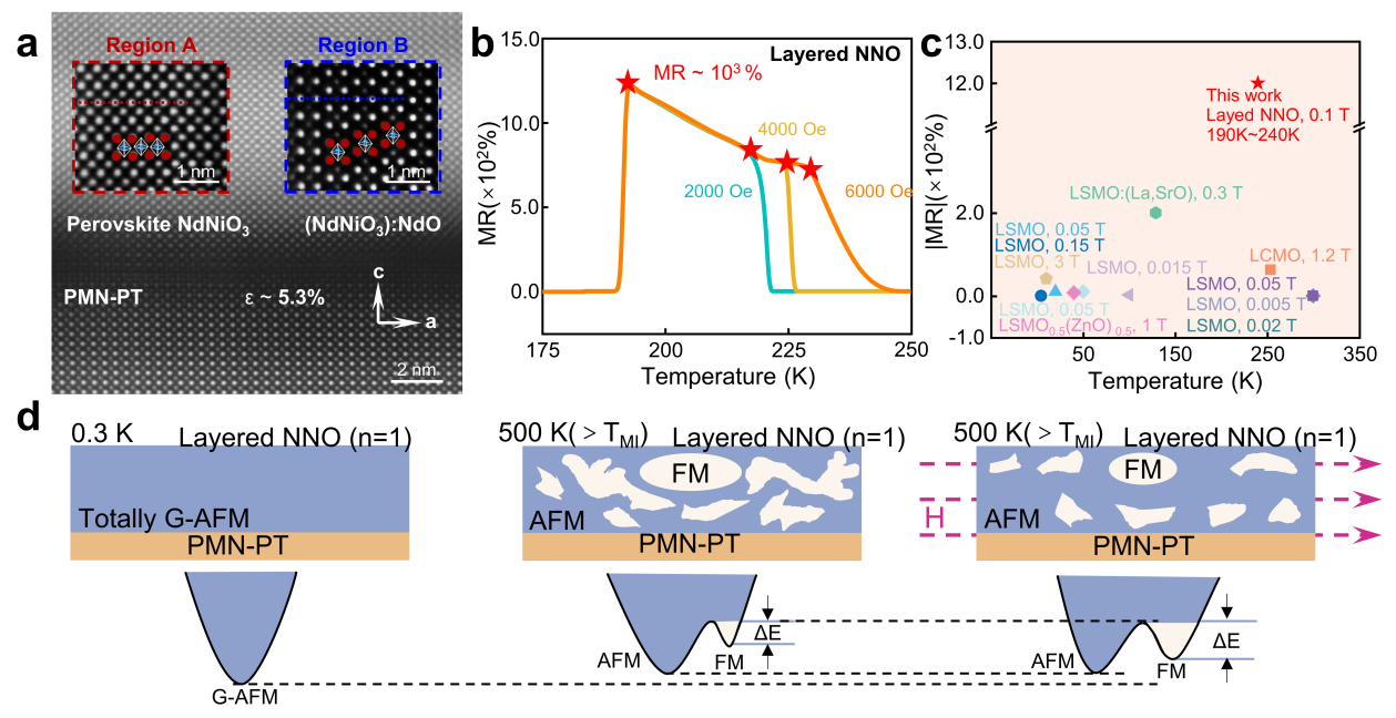 针对这一问题,西安交通大学电子科学与工程学院刘明教授团队赵亚楠副教授及其合作者制备了具有钙钛矿层状衍生物Ruddlesden-Popper 结构的(NdNiO3)n:NdO薄膜,其横截面结构如图a所示,表明薄膜中存在 (NdNiO3)n:NdO结构。在磁场和温度等外部刺激下,进一步研究了层状(NdNiO3)n:NdO薄膜的 LFMR 效应,层状(NdNiO3)n:NdO薄膜在较高温度范围内(190~240 K)观测到了显著的低场磁电阻(1.2×103%,0.1 T),如图b所示。并且当测试温度接近金属绝缘体相变点时,层状(NdNiO3)n:NdO薄膜中所需的外部磁场显著减小。仅数百奥斯特就足以改变电子态,与锰酸盐相比,这一要求要低得多,锰酸盐需要接近特斯拉的磁场,从而促进了低功率磁性器件的开发。