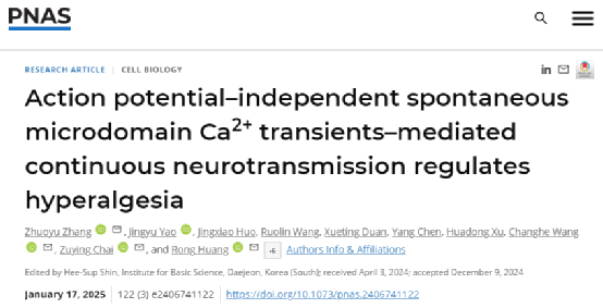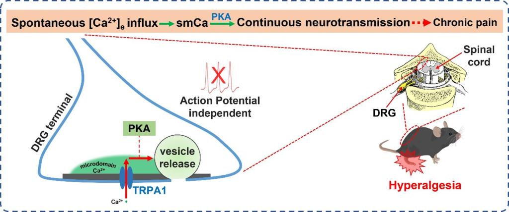 1月17日,西安交通大学黄荣团队领衔在《美国国家科学院院刊》(PNAS)发表题为《动作电位非依赖的自发微域钙瞬变介导的持续性神经分泌调控痛敏反应》(Action potential-independent spontaneous microdomain Ca2+ transients-mediated continuous neurotransmission regulates hyperalgesia)最新研究成果。该研究发现外周感觉神经元中的瞬时受体电位通道TRPA1存在自发性的通道开放,介导细胞外的Ca2+向细胞内的自发流入并形成膜表面微域范围的Ca2+热点(spontaneous microdomain Ca2+ hotspot, smCa),通过cAMP-PKA信号通路触发感觉神经元胞体区和脊髓处中枢突触的持续性自发囊泡分泌来释放神经递质/调质。在慢性疼痛病理过程中,“TRPA1➝smCa钙热点➝PKA➝自发囊泡分泌”通路得到显著增强,而抑制该通路的各环节能有效缓解慢性疼痛病理下的痛敏反应,提示其可能在慢性疼痛的发生和发展过程中发挥重要调控功能,有望为慢性疼痛的临床治疗提供新的理论指导和药物靶点。