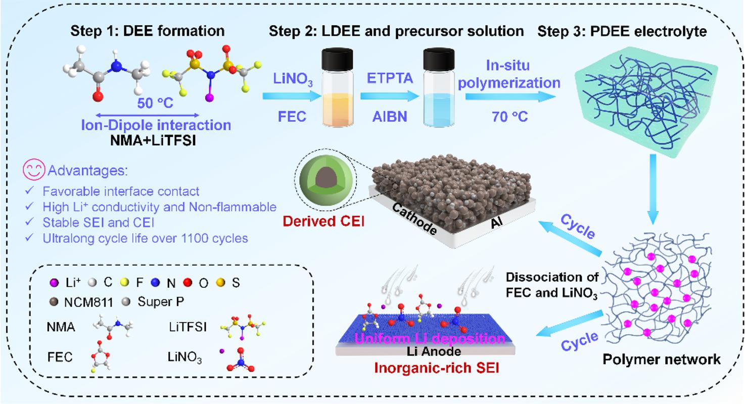 为应对这一挑战,西安交通大学电信学部电子学院徐友龙教授团队设计了一种不可燃的聚合物基深共晶电解质 (PDEE)。该电解质将本征不可燃的N-甲基乙酰胺 (NMA) 基深共晶电解液通过原位聚合封装在聚合物框架内。NMA和硝酸锂(LiNO3)中极性基团之间强大的 Li+-溶剂相互作用显著提高了LiNO3的溶解度,通过调节LiNO3的含量来控制锂沉积主体的内部亥姆霍兹平面,以实现快速的LiNO3电离动力学,确保锂沉积均匀和SEI中Li+的高交换率,构建出有利于提高电池循环寿命的固体电解质相界面。这种新型电解质表现出优异的电化学性能,在25°C时离子电导率为 2.5 mS cm-1以及0.61的锂离子迁移数。实现了LFP||PDEE-2||Li固体电池在 1 C 时1000次稳定循环,容量保持率为80.4%。这一成果为共晶溶剂基聚合物电解质的最佳性能之一,标志着锂金属电池向更高效、更安全的方向迈出了重要一步。