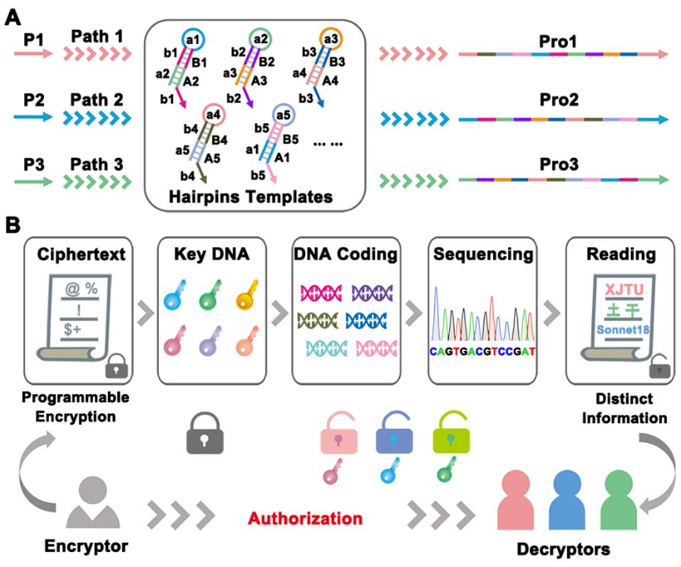 近日,西安交通大学赵永席教授团队成功开发了一种基于DNA序列顺序合成的信息编码与加密策略,可按需生成文本、图像等多类型信息,动态生成符合高级加密标准(Advanced Encryption Standard, AES)的安全密钥,以支持灵活的授权访问需求。研究团队创新性地设计了茎环结构探针介导的引物交换反应机制(hairpin-mediated primer exchange reaction, HAMER),通过特异性引物触发精确的链延伸与置换反应,启动特定DNA合成路径的级联反应,精准调控长链DNA的合成顺序,通过DNA分子条形码的可编程顺序拼接,即可依据预设的解密规则完成目标信息的读取与还原。该策略不仅具备根据权限动态生成密钥或信息的能力,还支持高度灵活的加密路径配置,大幅提升了系统的随机性与模糊性,有效增强了加密数据的抗破解性能。这一工作为DNA分子在未来信息安全系统中的高密度存储与高度安全加密应用奠定了技术基础。