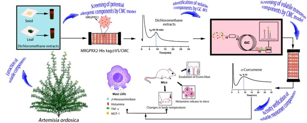 西安交大贺浪冲教授研究团队北上榆林地区,利用类过敏特异性受体MrgX2自主研制了CMC-过敏性气体分析仪,并结合GC-MS技术,对采集的全生命周期黑沙蒿植物样本进行系统筛查,首次发现α-姜黄烯、α-蒎烯、β-蒎烯和柠檬烯等五种挥发性致敏组分,均可通过MrgX2受体显著激活肥大细胞,引发类过敏反应。其中α-姜黄烯在黑沙蒿中含量较高、致敏活性较强。此外,通过测定不同月份植物样本中挥发性致敏组分的含量变化,发现上述挥发性致敏成分总含量随着植物生长逐渐升高,在平均温度较高的8、9月显著高于其他月份,与榆林市临床过敏性疾病的发病期高度吻合,为当地过敏性疾病的防治提供了关键实验依据,也为针对性治疗策略的制定指明了方向。