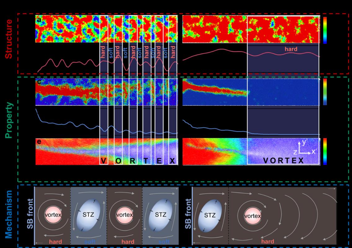 该研究首次从原子层面揭示了结构状态对剪切带传播机制的决定性作用。这些发现为非晶合金中剪切带的初始形成与传播的微观动力学提供了全新见解,强调了如何通过调节金属玻璃结构状态来控制剪切带行为。这为优化非晶合金的机械性能以满足特定工程应用需求带来了新的机遇。