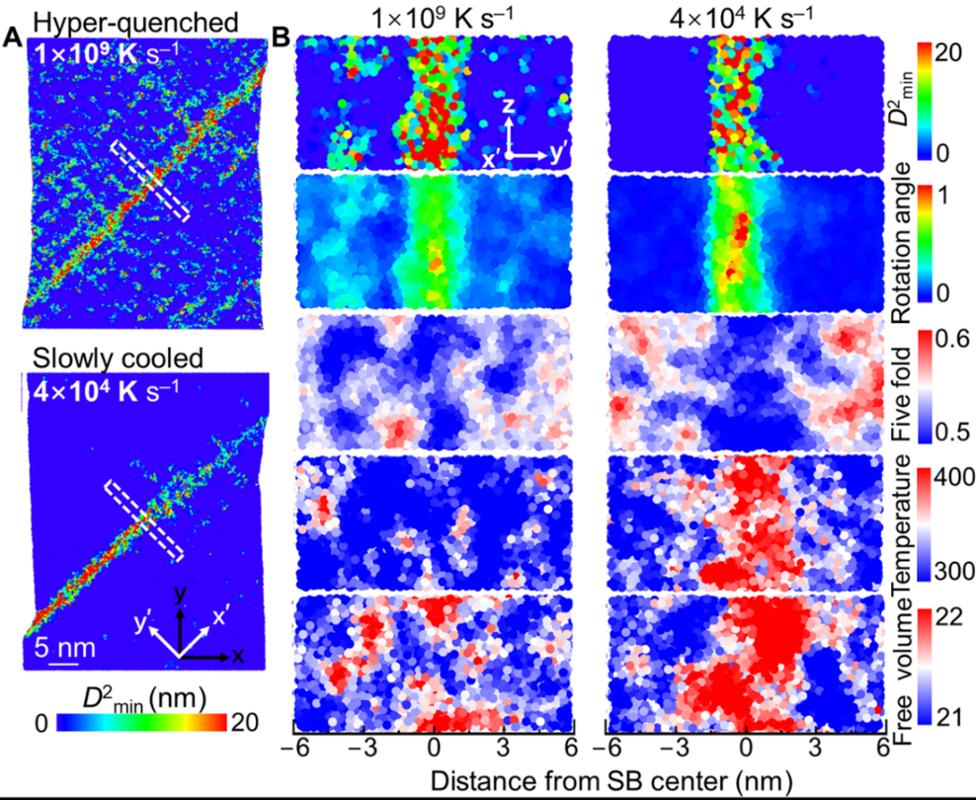 金属玻璃(又称非晶态合金)因其内部原子堆垛的无序结构,展现出高强度、高弹性等优异力学性能,但也使其在塑性变形过程中易发生纳米宽度的局域剪切带(shear bands)。剪切带的形成与扩展往往诱发材料的脆性断裂,严重制约了金属玻璃在工程领域的推广应用。剪切带的形成和演化是一个涉及原子尺度至宏观尺度的多重耦合过程。由于其在微秒时间尺度下发生,传统实验手段难以直接观察其原子机制;另一方面,传统分子动力学模拟受限于计算成本,往往采用远高于实验条件的冷却速率(>10¹⁰ K/s)制备金属玻璃模型,导致所得结构状态与真实材料存在很大偏差,难以实现剪切变形机制的准确还原。因此,揭示剪切带如何萌生与传播的微观机制成为凝聚态物理、材料力学与计算材料科学交叉领域中的前沿难题。