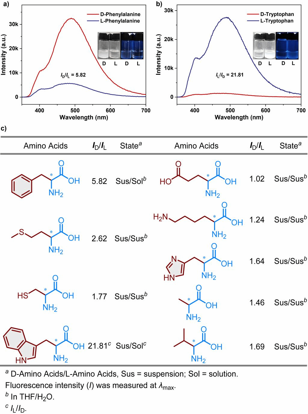 为应对上述挑战,西安交通大学化学学院张彦峰教授、焦佼副教授联合济南大学聂永教授开发了一种高度立体选择性的手性碳硼烷衍生物的不对称合成方法。该方法采用商品化的起始材料,能够通过两步一锅法精确构建光学纯手性毗邻桥联碳硼烷衍生物,实现10克以上的规模化制备,且无需手性HPLC分离。在将共轭发色团引入该结构之后,获得了一系列性能优异的CPL活性分子。而且,将碳硼烷引入手性桥联结构中显著增强了发光化合物的ΦPL(最大提高30%)和glum(最大提高至9倍),这也是首次发现碳硼烷对化合物发光行为的“双提升”现象。应用其中一种手性发光化合物,在水相中实现了对几种氨基酸的良好对映选择性荧光识别。