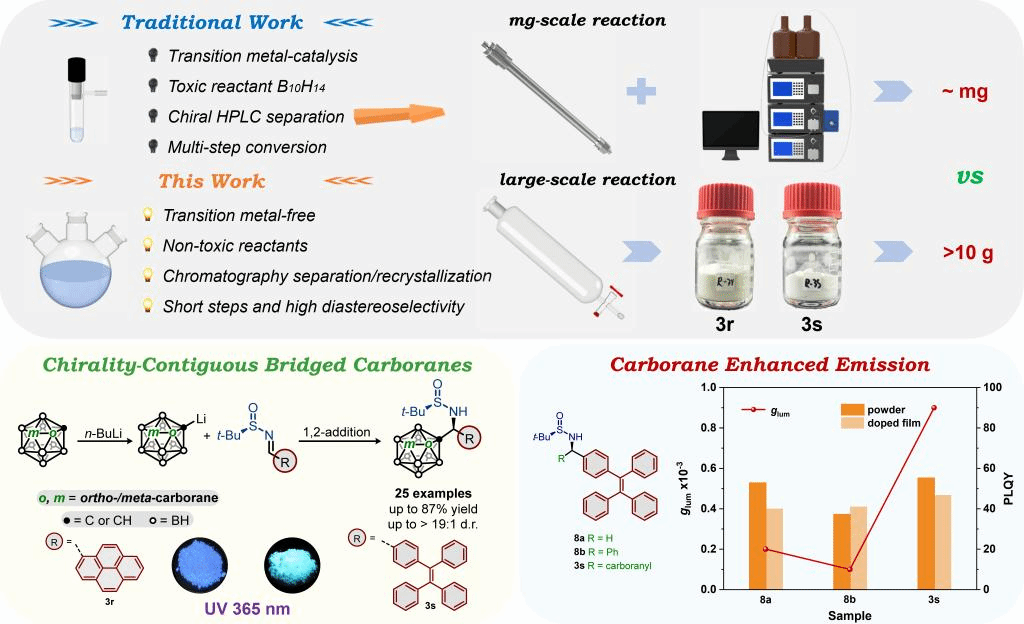 尽管近年来碳硼烷衍生物的发光特性已经得到了广泛研究,但碳硼烷基手性发光化合物的开发及其手性特性的探索与上述挑战是一致的,圆偏振发光手性小分子的探索仍然长期受制于复杂的合成路线及缺乏高效的大规模制备方法。具体而言,具有CPL活性的碳硼烷衍生物的常规合成策略主要依赖于①手性炔烃-癸硼烷的加成反应或②过渡金属催化的不对称B-H键活化反应。这些方法需要剧毒前体癸硼烷或昂贵的催化体系,通常也需要借助手性HPLC拆分实现对映体分离,导致成本高昂、研究样本单调以及制备规模不足,进而限制了对其光电特性的综合研究。因此,开发简洁且环保的不对称合成方法以实现对光学纯碳硼烷衍生物的可扩展和多样化制备对于其光电性质和构效关系的研究至关重要。