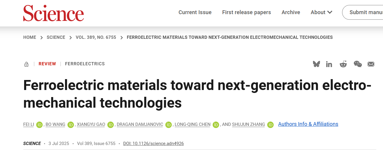7月4日,西安交通大学电信学部电子学院、国家医学攻关产教融合创新平台李飞教授团队受邀撰写的综述论文《面向下一代电机耦合技术的铁电材料》(Ferroelectric Materials toward Next-Generation Electromechanical Technologies)在《科学》(Science)期刊发表,这是该期刊发表的首篇关于压电材料与器件的综述论文。