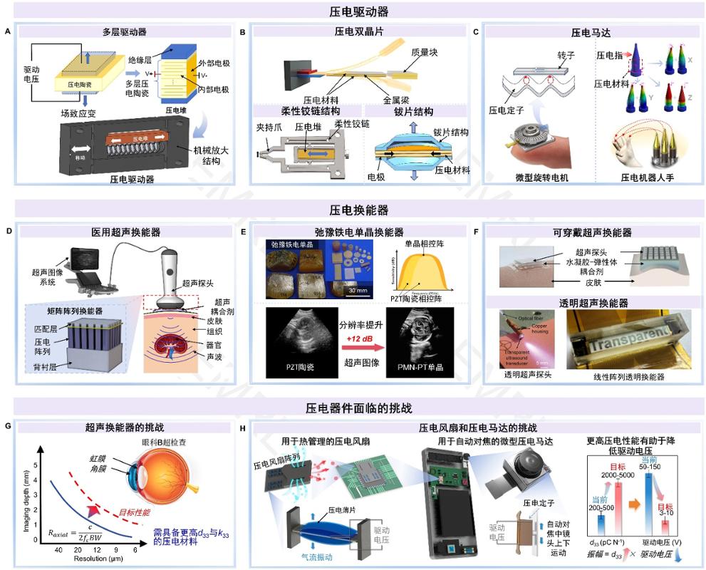 图.基于铁电材料的压电器件及其所面临的挑战:(A) 多层压电驱动器工作原理,(B) 双晶片、柔性铰链与钹形结构的压电驱动器,(C) 微型压电马达与压电机械手臂示意图;(D) 医用超声成像原理,(E) 弛豫铁电单晶换能器相较于陶瓷换能器在成像上的高分辨率与宽带宽优势,(F) 可穿戴、透明及线性阵列超声换能器;(G) 医疗超声领域提升换能器成像深度与分辨率的技术难题;(H) 消费电子中压电风扇和压电马达实现低电压驱动的瓶颈(来源:原文图1)