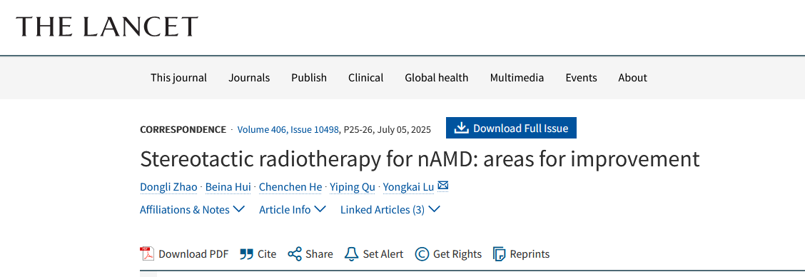 2025年7月,国际顶级医学期刊《柳叶刀》(The Lancet)在线刊发了西安交通大学第一附属医院肿瘤放疗科赵东利教授作为第一作者撰写的书信文章《Stereotactic radiotherapy for nAMD: areas for improvement》(《新生血管性年龄相关性黄斑变性的立体定向放疗:改进方向探讨》)。文章聚焦同期发表于该刊的英国STAR临床试验,从放疗专业视角出发,探讨立体定向放射治疗(SRT)在新生血管性老年性黄斑变性(nAMD)治疗中的实际挑战与优化空间。